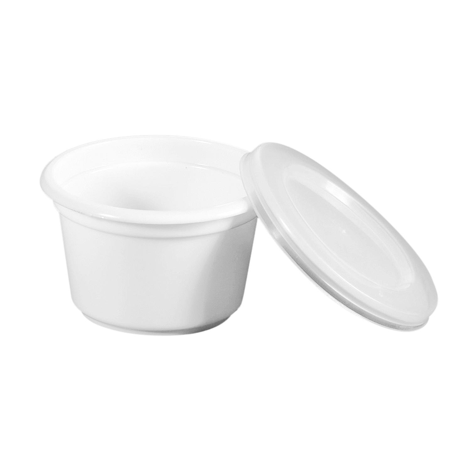 weiße Portionsbecher aus PS ( Polystyrol ) mit separatem transluzentem Deckel aus PE - Füllinhalt: 28 ml - Durchmesser: 4,5 cm - Höhe: 2,8 cm - zur Portionierung von z.B. Kräuterbutter oder Marmelade