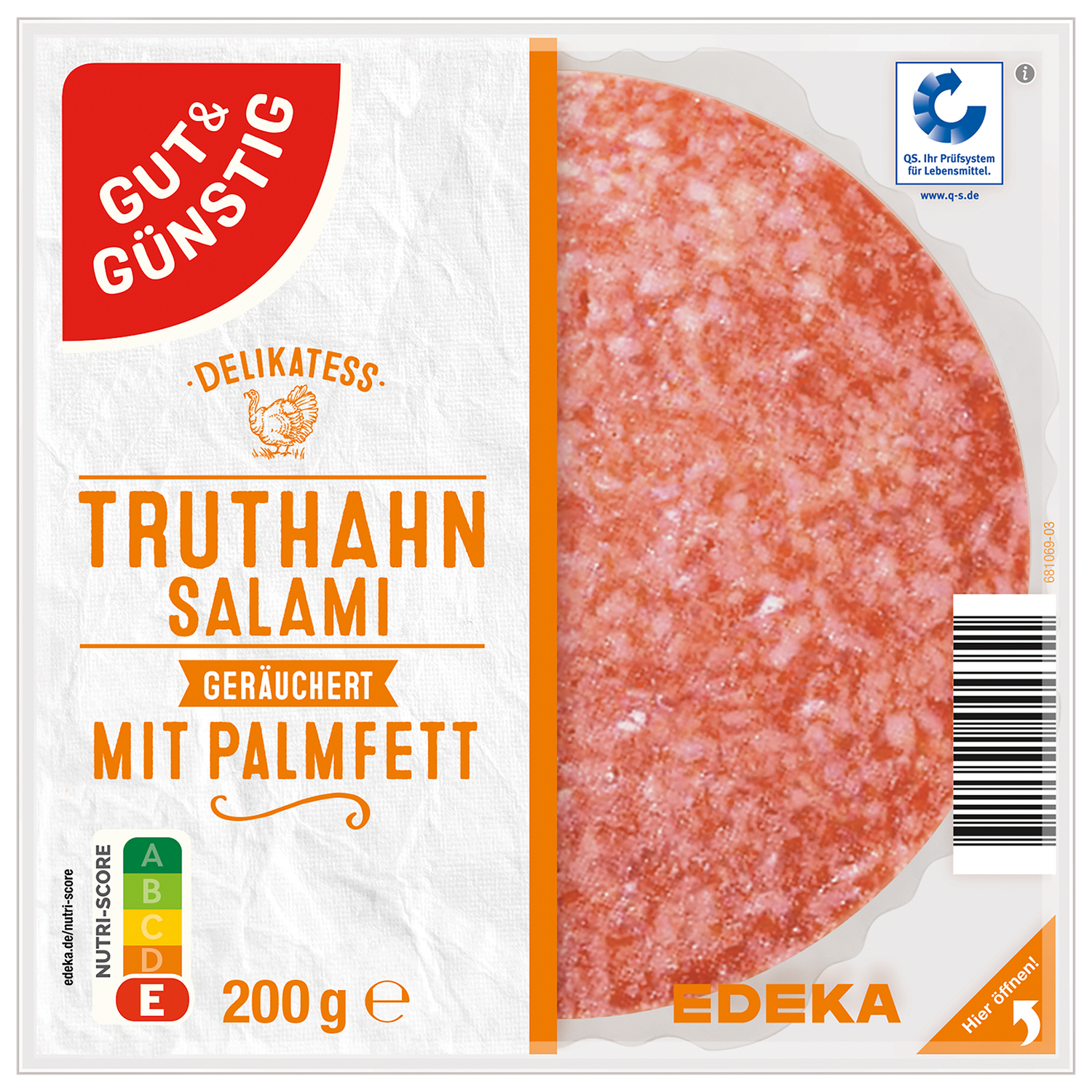 Zutaten Zutaten: Truthahnfleisch**, Palmfett, jodiertesb Speisesalz (Speisesalz, Kaliumiodat), Glukosesirup,b Gewürze, färbendes Rote Bete-Pulver, Dextrose, Gewürzextrakte, Antioxidationsmittel: Natriumascorbat; Konservierungsstoff: Natriumnitrit; Reifekulturen, Buchenholzrauch. 100g Truthahnsalami werden aus 113g Truthahnfleisch und 8g Palmfett hergestellt. **QS-Ware. Kann Spuren von SENF, SELLERIE und MILCH enthalten.