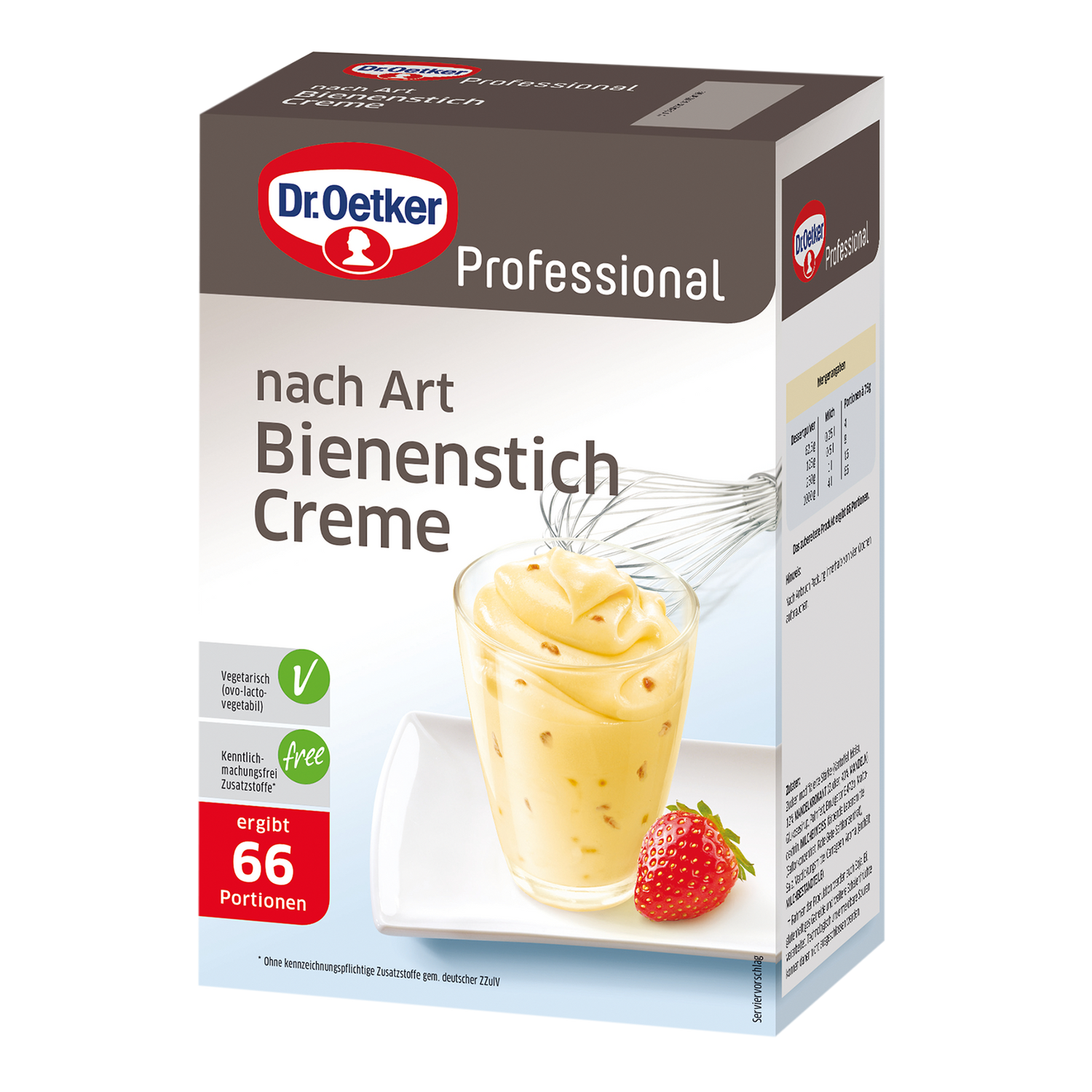 | Zubereitungshinweis | ***Aufschlagen*** 1. Die erforderliche Menge Milch in ein hohes Gefäß geben. 2. Die entsprechende Menge Cremepulver einrühren. 3. Mit einem Rührgerät oder einer Anschlagmaschine ca. 5 Minuten auf höchster Stufe aufschlagen. 4. portionieren und mindestens 1 Stunde kalt stellen. Dosierung: 250 g Dessertpulver auf 1 l Milch. |