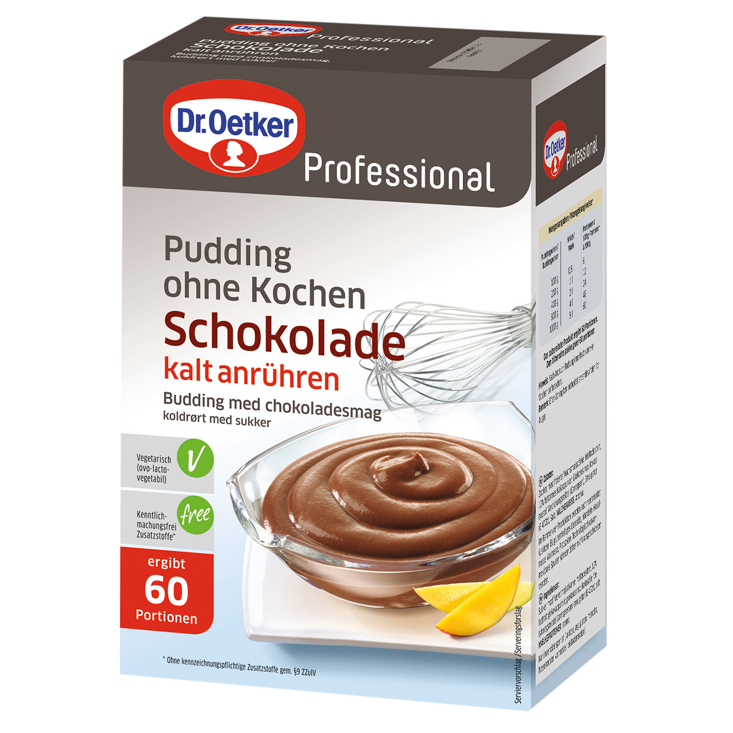 | Zubereitungshinweis | ***Mischen*** 1. Die erforderliche Menge kalte Milch in ein hohes Gefäß geben. 2. Die entsprechende Menge Cremepuddingpulver dazugeben und mit einem elektrischen Rührgerät auf niedrigster Stufe oder mit einem Schneebesen 2 Minuten verrühren. 3. Flüssig portionieren und mindestens 1 Stunde kalt stellen. Dosierung: 200 g Cremepulver auf 1 l Milch. |