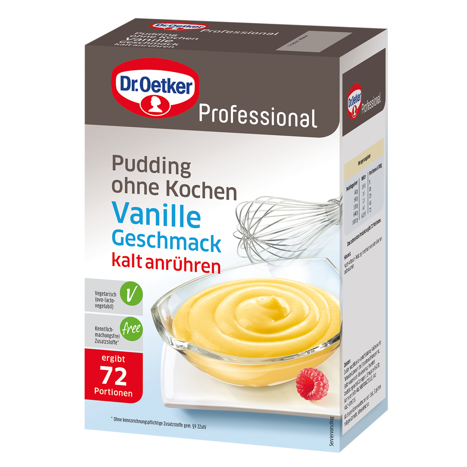 | Zubereitungshinweis | ***Mischen*** Die erforderliche Menge kalte Milch in ein hohes Gefäß geben. Die entsprechende Menge Cremepuddingpulver dazu geben und mit einem elektrischen Rührgerät auf niedrigster Stufe 2 Minuten verrühren. Flüssig portionieren und mindestens 1 Stunde kalt stellen. Dosierung: 160 g Cremepulver auf 1 l Milch. |