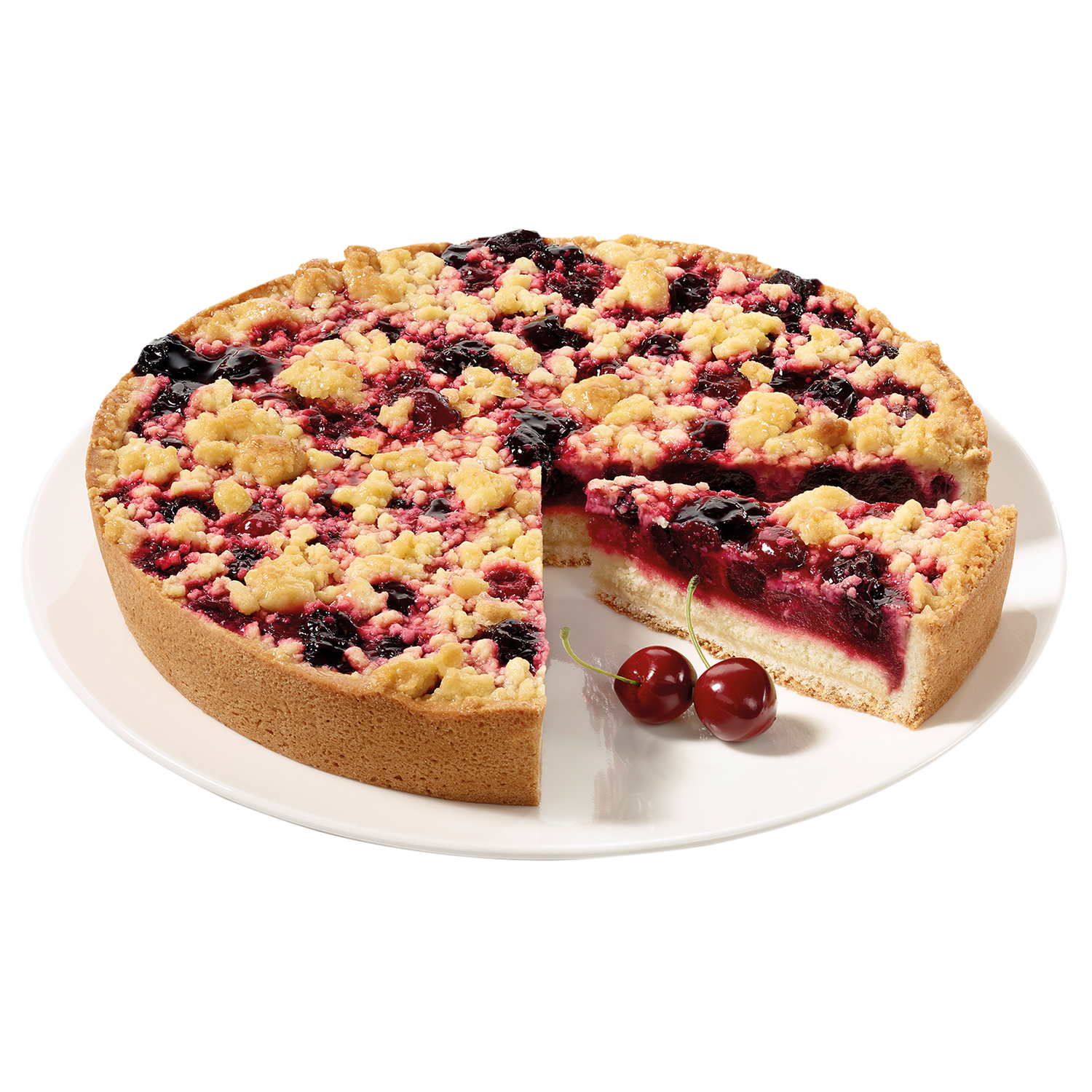 | Verkehrsbezeichnung: | Auf einem Mürbeiteigboden und einem hellen Rührteigboden liegt eine Kirsch-Zubereitung (20%) und eine Mischung aus Süß- und Sauerkirschen, mit Butterstreusel (11%) bedeckt und Tortenguss abgeglänzt, tiefgefroren, vorgeschnitten in 12 Portionen. |