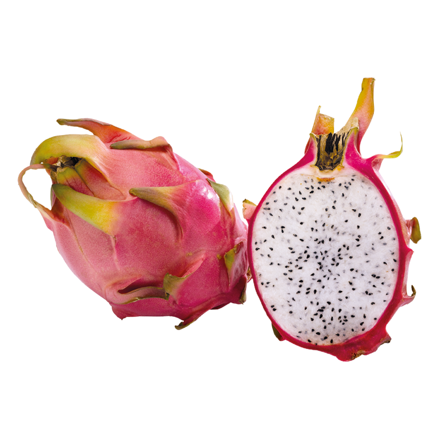 Das weiße, cremige Fruchfleisch dieser sehr dekorativen, rotschaligen, aus dem subtropischen Süd- und Mittelamerika stammenden Kakteenfrucht ist von schwarzen Samenkörnern durchsetzt und schmeckt angenehm säuerlich.