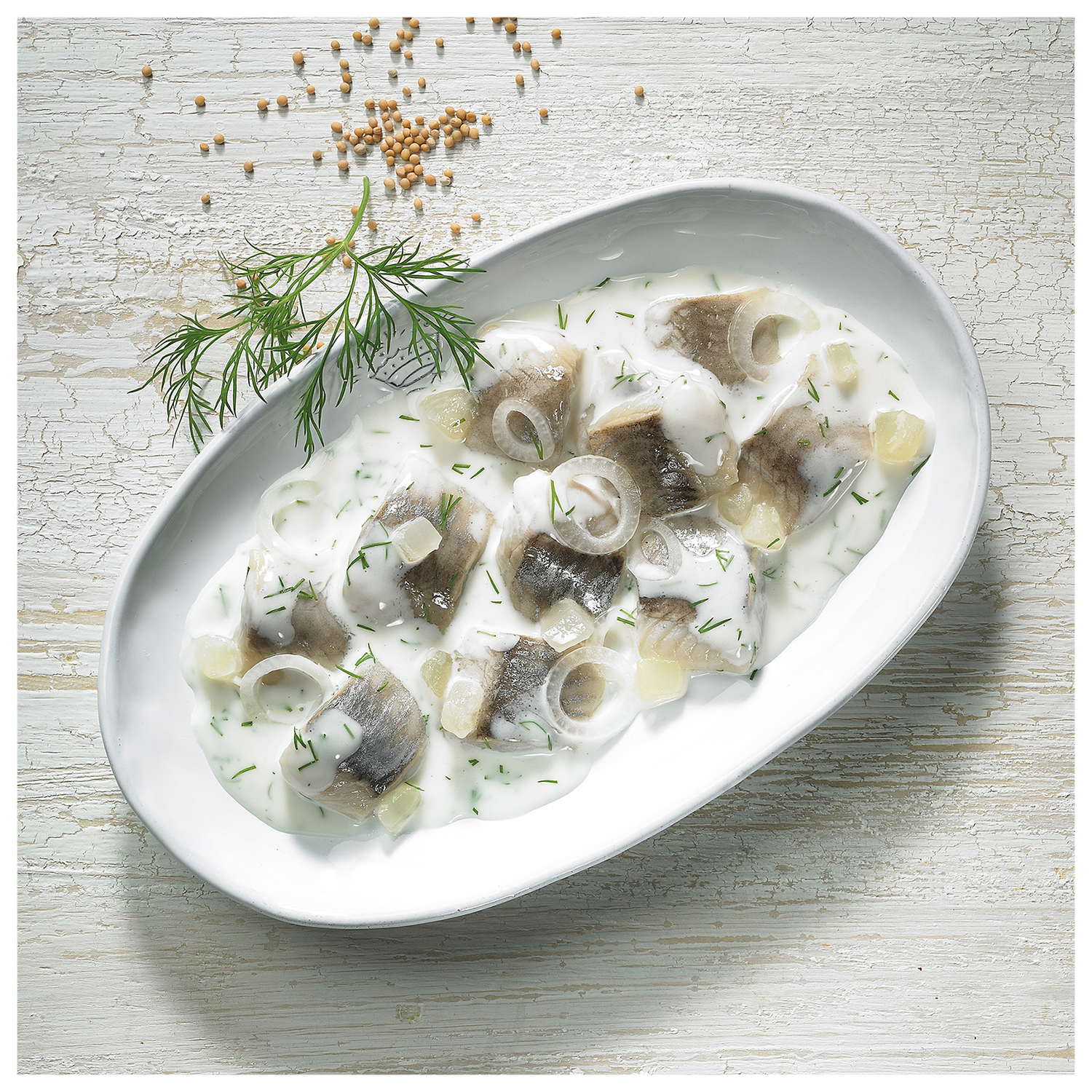 | Zutatenliste | Zutaten: HERING 50 % (Clupea harengus*), Rapsöl, JOGHURTERZEUGNIS, Gurken, Zucker, Trinkwasser, CRÈME FRAÎCHE, Zwiebeln, Branntweinessig, EIGELB, modifizierte Stärke, Speisesalz, Stärke, SENFSAATEN, Gewürze, Dill, Aroma, Verdickungsmittel: Guarkernmehl, Xanthan; Säuerungsmittel: Essigsäure; Säureregulator: Natriumacetate *gefangen mit Schleppnetzen oder Ringwaden im Wildfang im Nordostatlantik FAO 027.II (Norwegische See) und FAO 027.IV (Nordsee) |