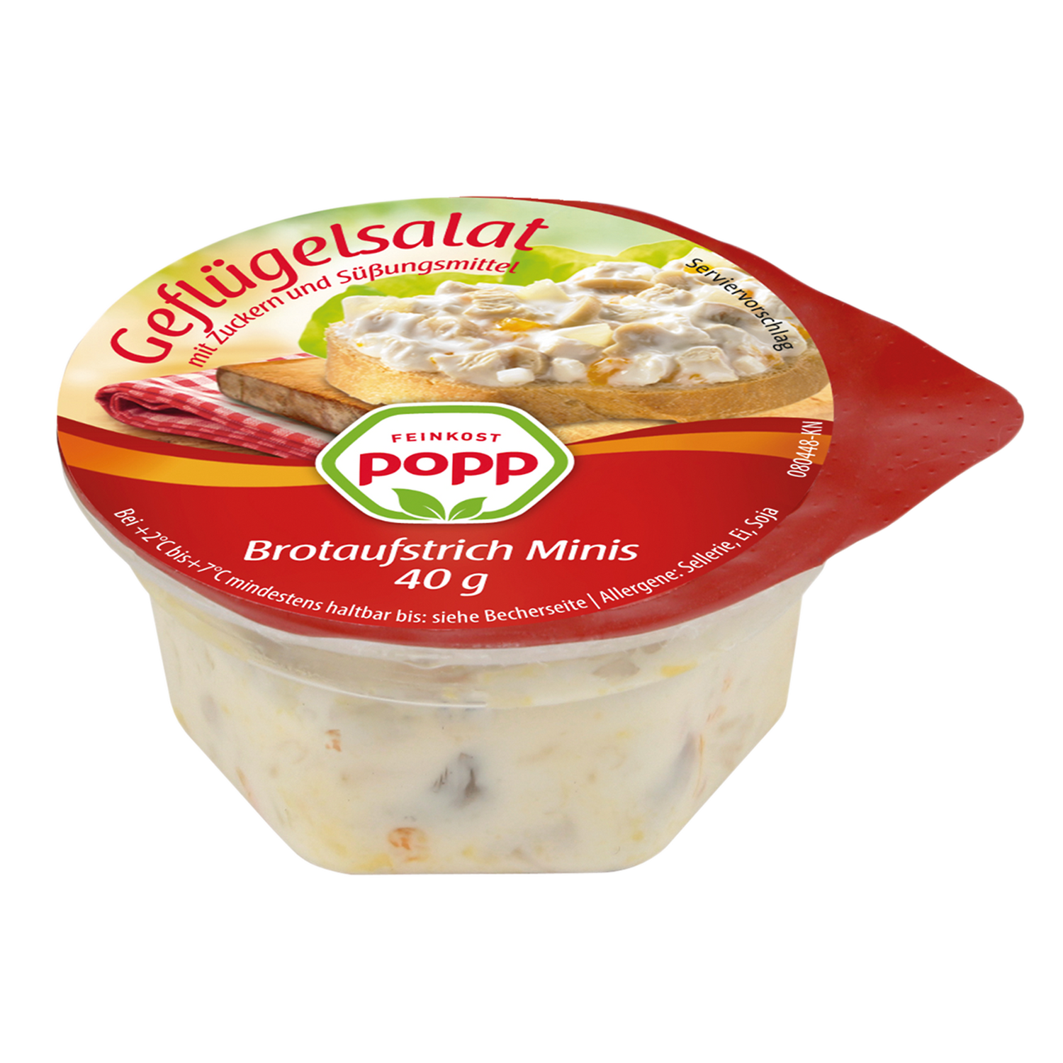| Verkehrsbezeichnung: | Brotaufstrich Minis Geflügelsalat mit Zuckern und Süßungsmittel |
