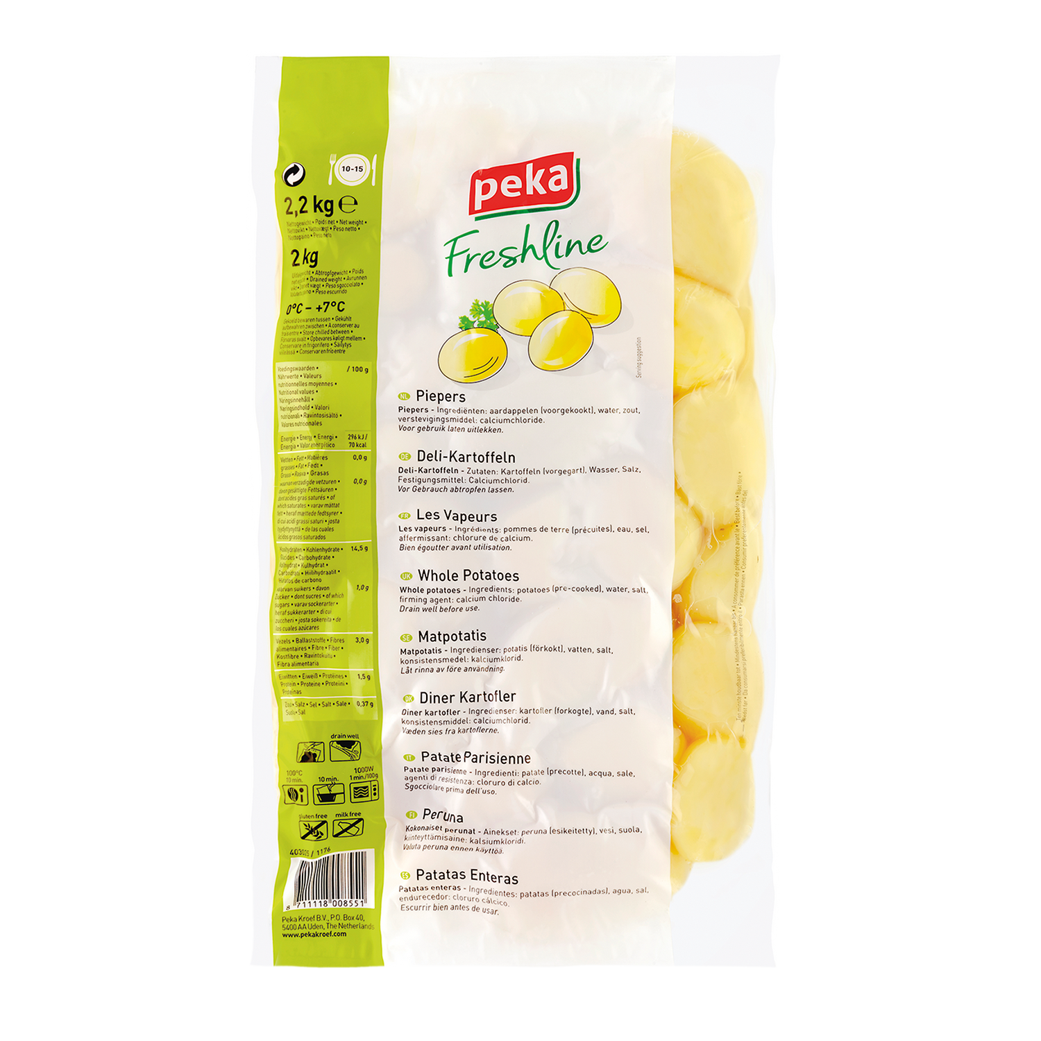 | Zutatenliste | Kartoffeln (vorgegart), Wasser, Salz, Festigungsmittel: Calciumchlorid. |