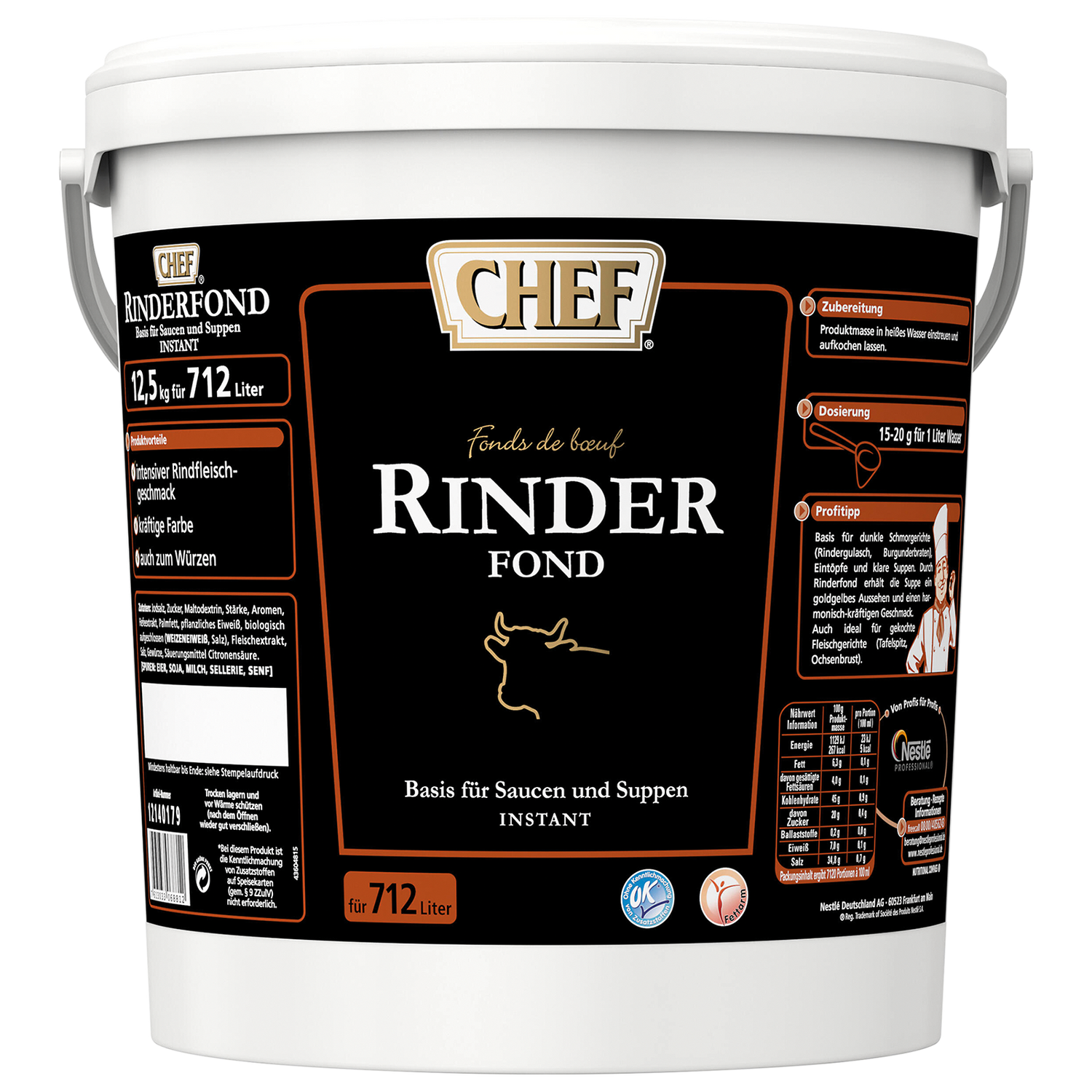 | Zubereitungshinweis | ***Sieden*** Zubereitung: CHEF Rinderfond ist sofort löslich. Produktmasse in heißes Wasser einrühren und aufkochen. Dosierung: 15 g für 1 Liter Wasser |