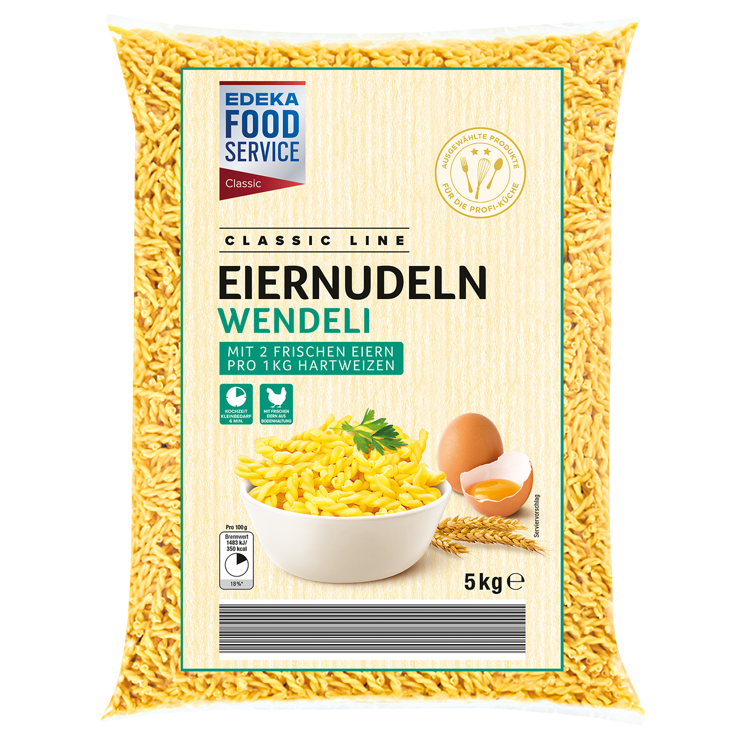| Zubereitungshinweis | Kochempfehlung für Grossküchen: Kurzkochzeit 4 Min.: Die Wendeli in die ca. 8-fache Menge kochendes, leicht gesalzenes Wasser schütten, mehrmals umrühren und leicht sprudelnd vorkochen. Kochempfehlung für den Kleinbedarf: Kochzeit 6 Min.: Wendeli in die ca. 10-fache Menge kochendes, leicht gesalzenes Wasser schütten, mehrmals umrühren und nach Kochzeitangabe leicht sprudelnd kochen. In ein Sieb abgießen und abtropfen lassen und ein Stück Butter oder Öl unterziehen. Heiß servieren. |