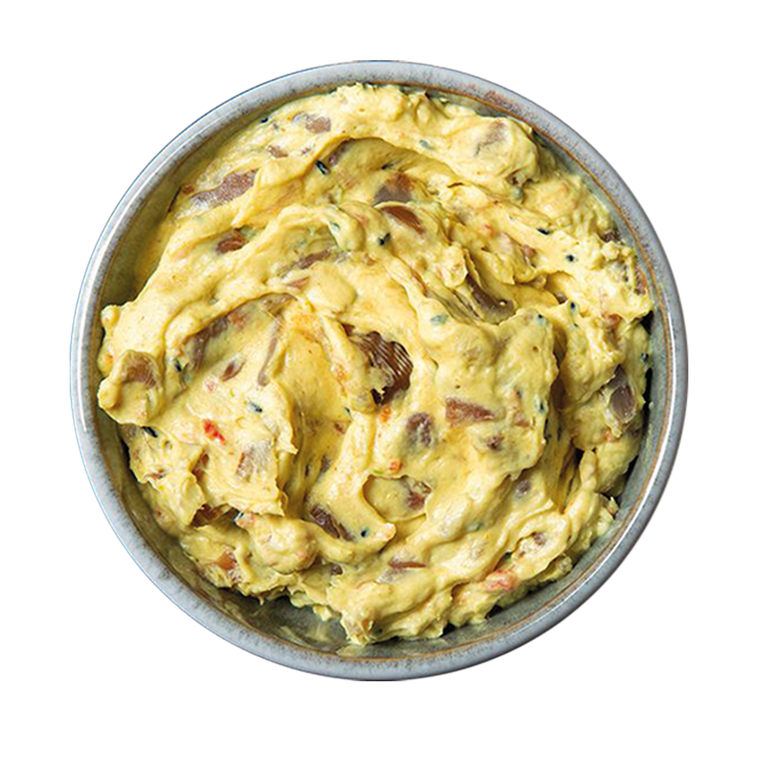 | Zutatenliste | Zutaten: FRISCHKÄSE 32%, getrocknete Datteln eingelegt 28% (getrocknete Datteln, Trinkwasser), CRÈME FRAÎCHE 24 %, Branntweinessig, Lauchzwiebeln, Rapsöl, Zucker, Speisesalz, Kirschpaprika, Schwarzkümmel, Honig, färbendes Karottenkonzentrat, Zitronenschale, Curry (enthält SENFMEHL), Zitronensaftkonzentrat, Stärke, Gewürze, Verdickungsmittel: Guarkernmehl, Säureregulator: Natriumacetate |