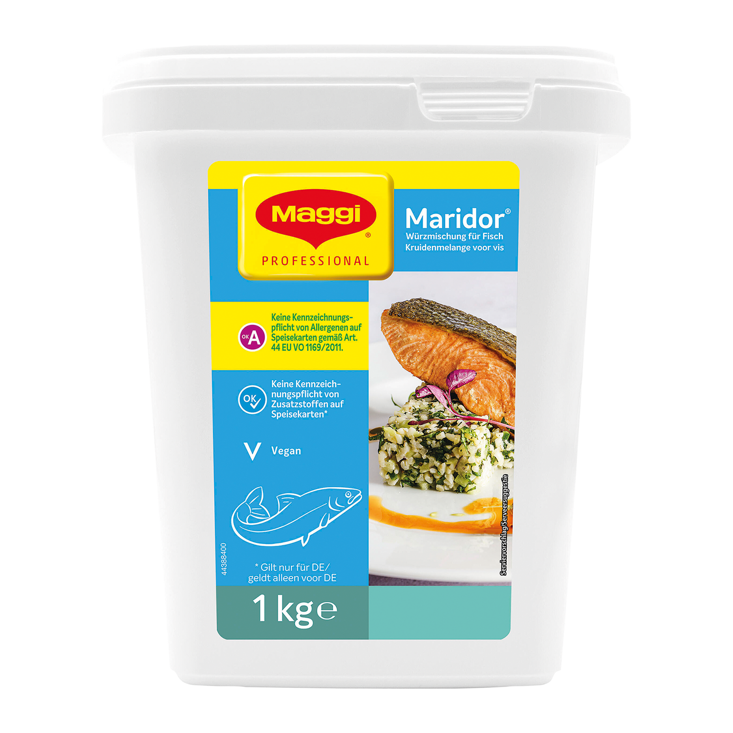| Zubereitungshinweis | ***Sieden*** Dosierung: Für 1 kg Fisch/Speise rechnet man mit ca. 14 g MARIDOR. Zubereitung: Produkt gleichmäßig mit MARIDOR bestreuen und dann wie üblich zubereiten. |