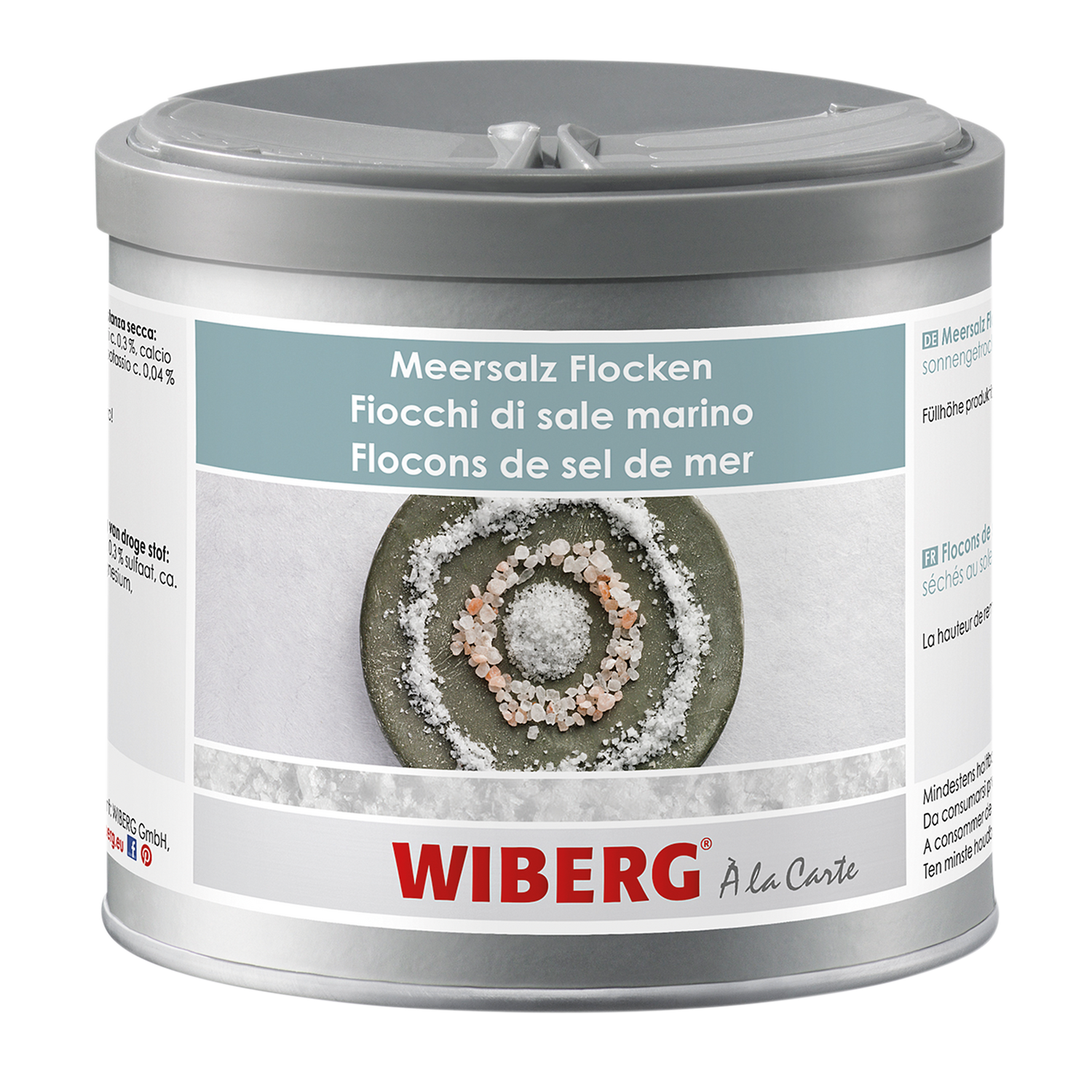 Wiberg benennt sein Fleur de Sel einfach als Meersalzflocken. Fleur de Sel ist ein Meersalz welches aus Meerwasser in Salzgärten oder anderen Verfahren gewonnen wird.