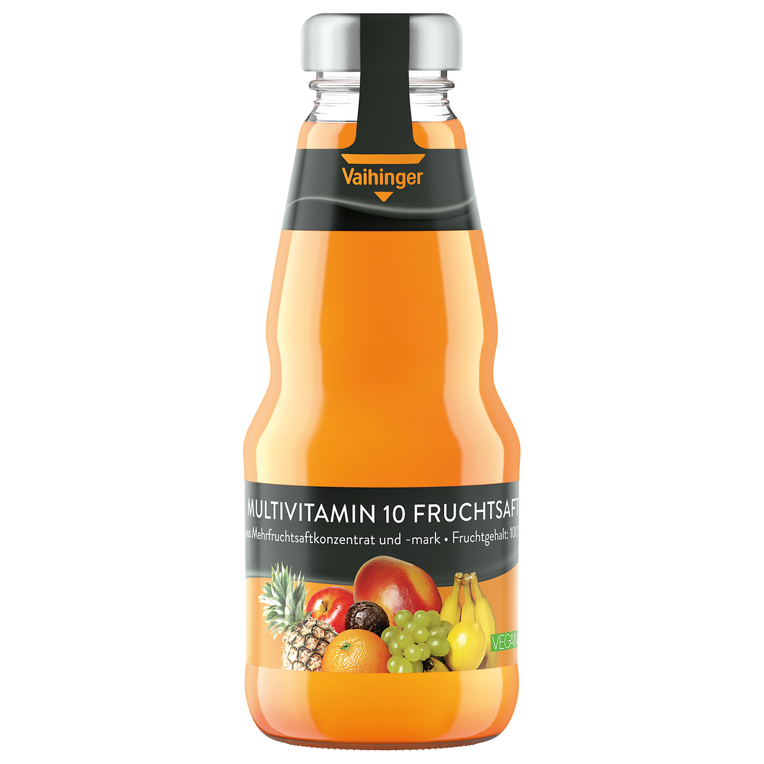| Verkehrsbezeichnung: | Multivitamin 10 Fruchtsaft, 100 % Fruchtgehalt, aus Mehrfruchtsaftkonzentrat und Fruchtmark. |