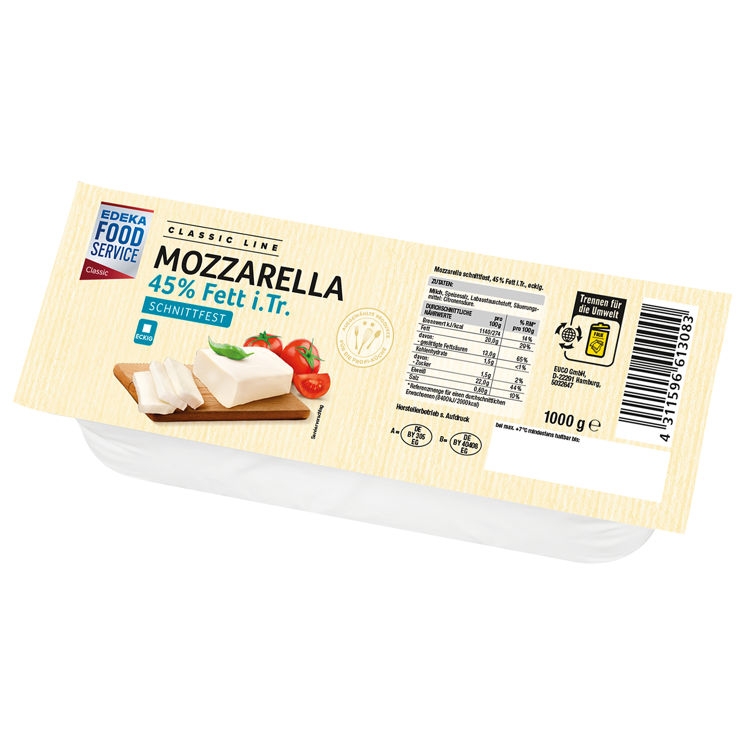 | Verkehrsbezeichnung: | Mozzarella schnittfest, 45% Fett i.Tr., eckig. |