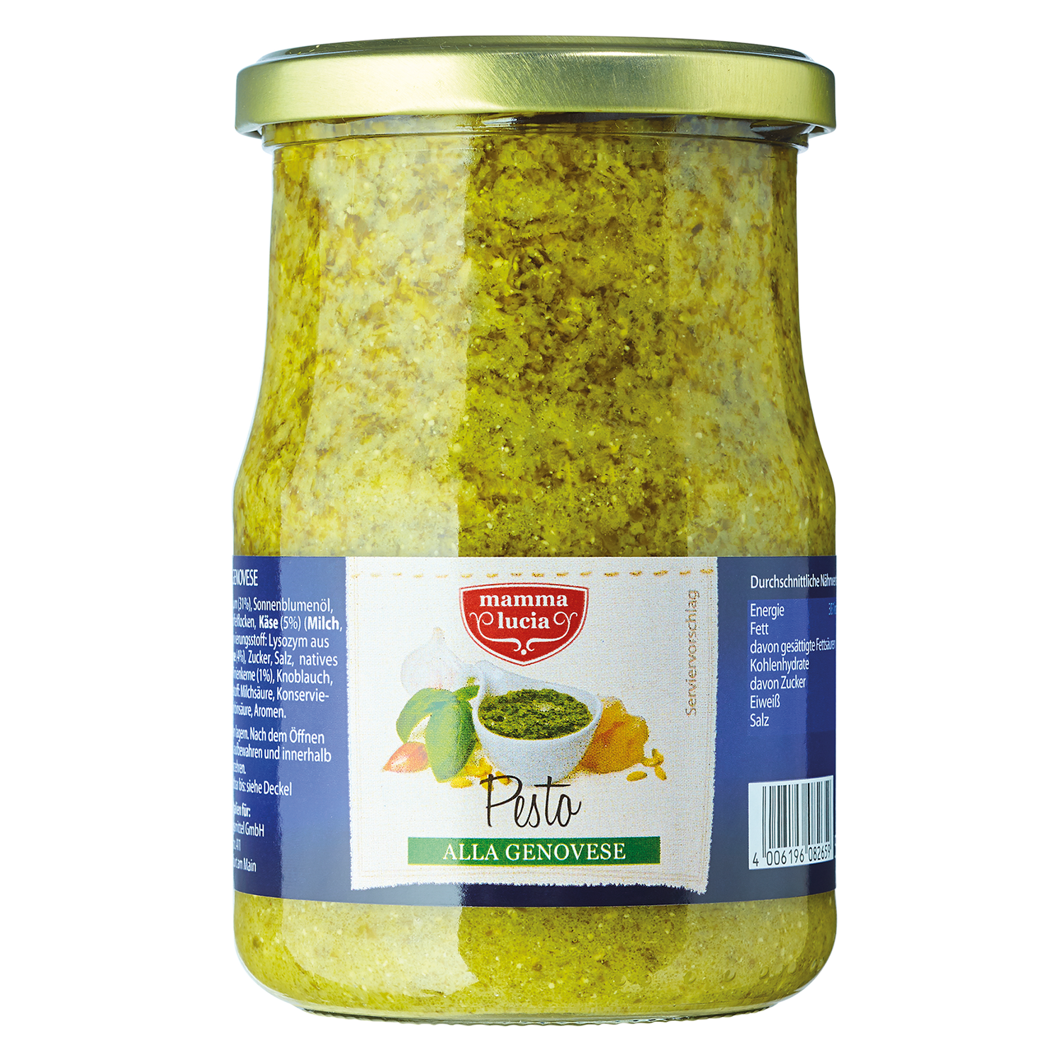 | Zutatenliste | Zutaten: Basilikum 31%, Sonnenblumenöl, Kartoffeln, Kartoffelflocken, Käse 5% (MILCH, Salz, Lab), CASHEWKERNE 4%, Zucker, Salz, natives Olivenöl extra, Pinienkerne 1%, Knoblauch, Säureregulator: Milchsäure, Antioxidationsmittel: Ascorbinsäure, Aromen. |