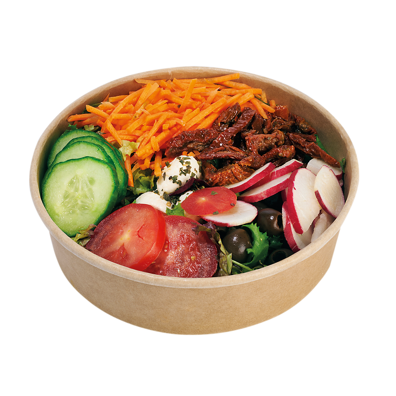 | Zutatenliste | Zutaten: 37% Salatmischung (Lollo Bionda, Lollo Rosso, Radicchio, Frisee, Rucola), Tomaten, 11% Mozzarella 45% Fett i.Tr. (pasteurisierte KUHMILCH, Salz, Säuerungsmittel: E330, mikrobielles Lab), Gurke, 8% getrocknete Tomaten in Sonnenblumenöl (80% getrocknete Tomaten, Sonnenblumenöl, Salz, Gewürze, Antioxidationsmittel: E300; Säureregulator: E330), schwarze Oliven (Oliven, Salz), Möhren, Radieschen, Basilikum. |
