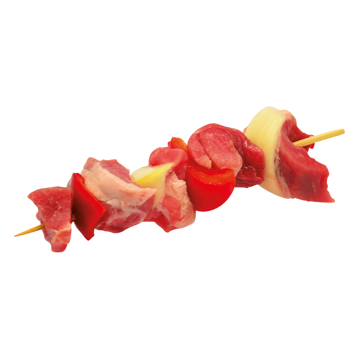 Schweinefleisch, mit Zwiebeln und Paprika auf Bambusspieße gesteckt.