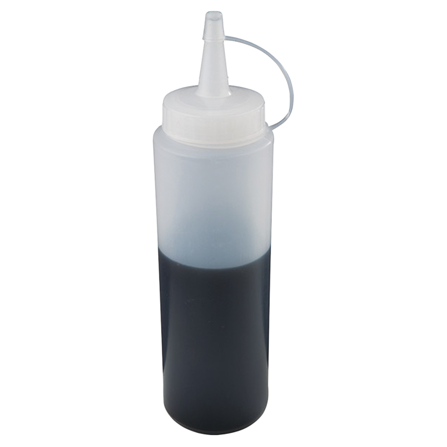 Mit der durchscheinenden quetschbaren Kunststoffflasche und der dazugehörigen Präzisionskanüle lassen sich ideal Gerichte punktgenau mit Ölen, Saucen, Marinaden und allen anderen - auch halbfesten - Flüssigkeiten dekorieren.