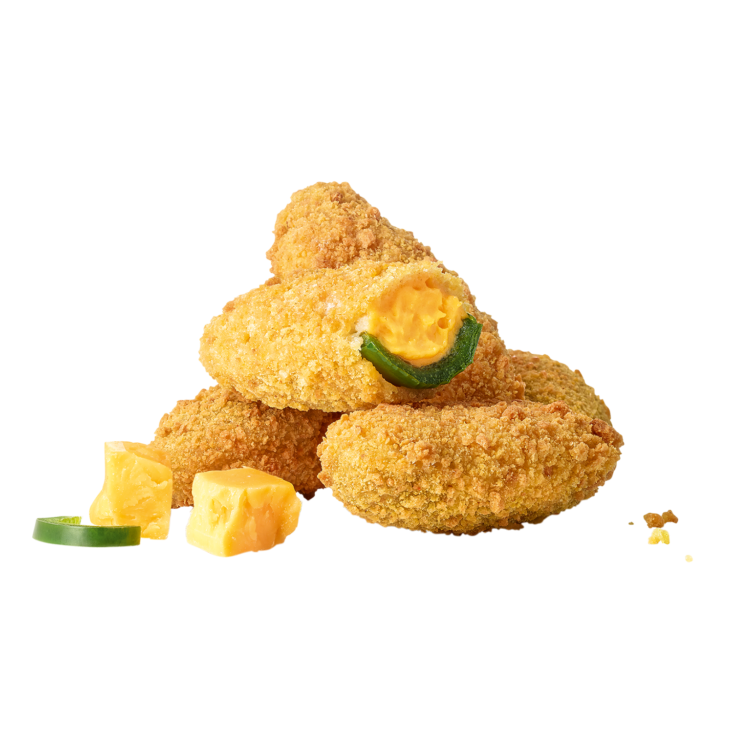 | Verkehrsbezeichnung: | Grüne Jalapeño-Chili-Schoten gefüllt mit einer Cheddar-Schmelzkäsezubereitung, in knuspriger Panade, vorgebacken, zum erneuten Durcherhitzen, tiefgefroren. |