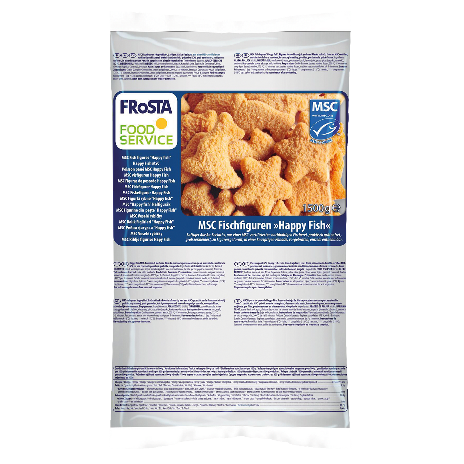 Aus Alaska-Seelachs, zu Figuren geformt, in einer knusprigen Panade, vorgebraten, einzeln entnehmbar, tiefgefroren.
