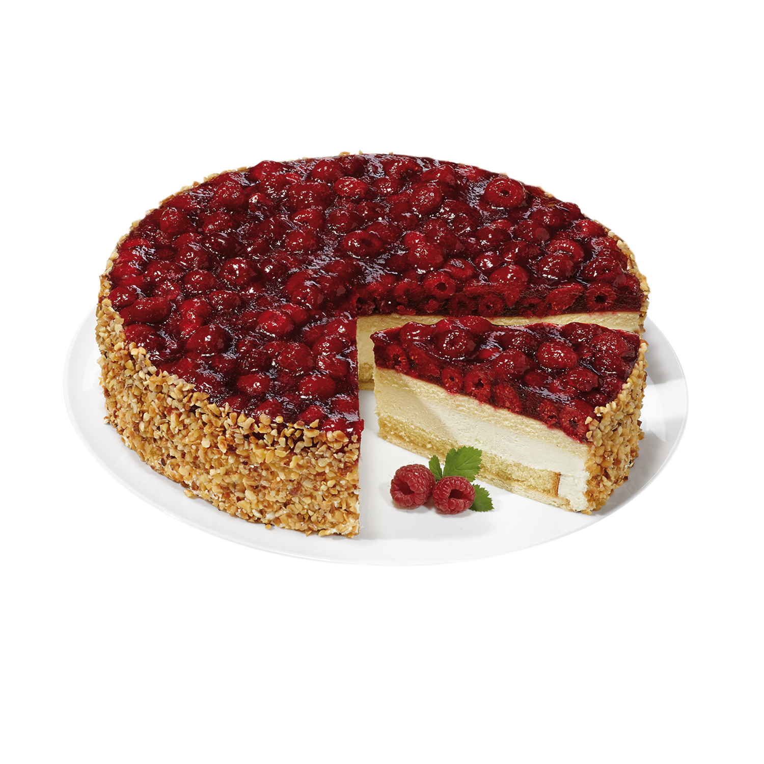 | Verkehrsbezeichnung: | Käse-Sahne-Füllung (35%) zwischen zwei hellen Biskuitböden auf einem Mürbeteigboden, mit Himbeeren belegt und mit Tortenguss abgeglänzt, randgarniert mit gehackten und gerösteten Haselnüssen, tiefgefroren. |
