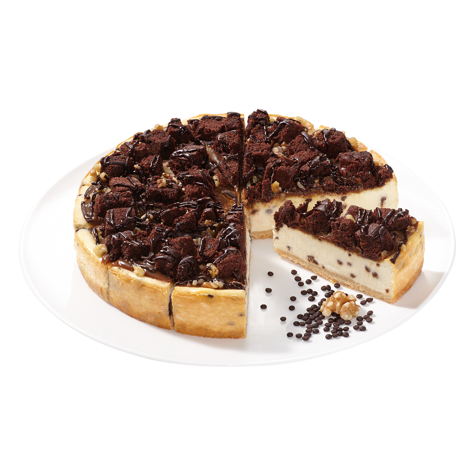 Welcome to the sweet and salty adventure! Ein salziger Bröselboden trifft auf köstliche Karamell-Creme, leckere Brownie-Würfel und Walnüsse. Gebettet auf einer cremigen mit Schoko-Tropfen durchzogenen Mascarpone-Käsemasse und mit dunklenKringeln dekoriert ist dieser Cheesecake ein Hingucker in jeder Kuchentheke!