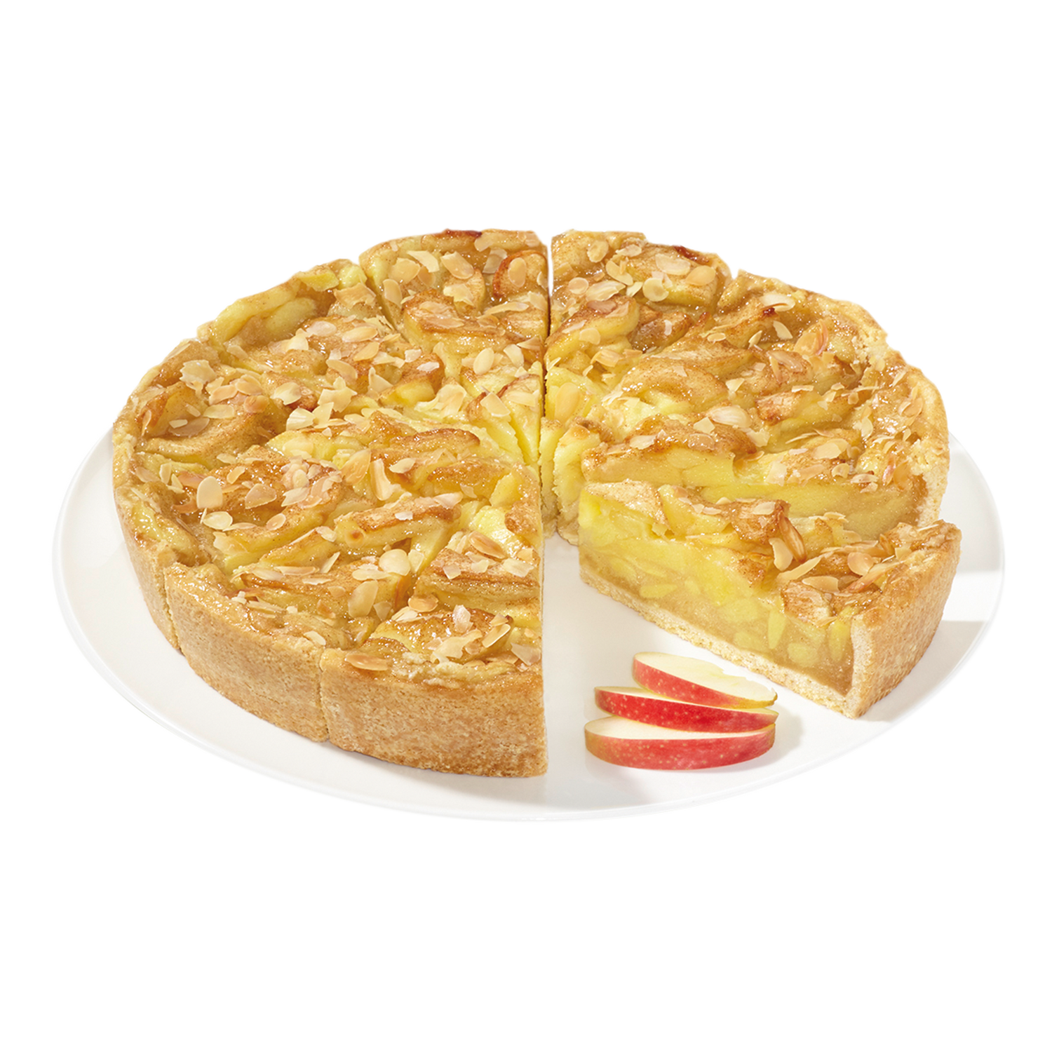 | Verkehrsbezeichnung: | Mürbeteigboden mit Apfel-Füllung (45%) und Apfelspalten (28%), mit Zucker-Zimt-Mix abgepudert, Tortenguss abgeglänzt und gehobelten gerösteten Mandeln dekoriert, tiefgefroren, vorgeschnitten in 12 Portionen. |