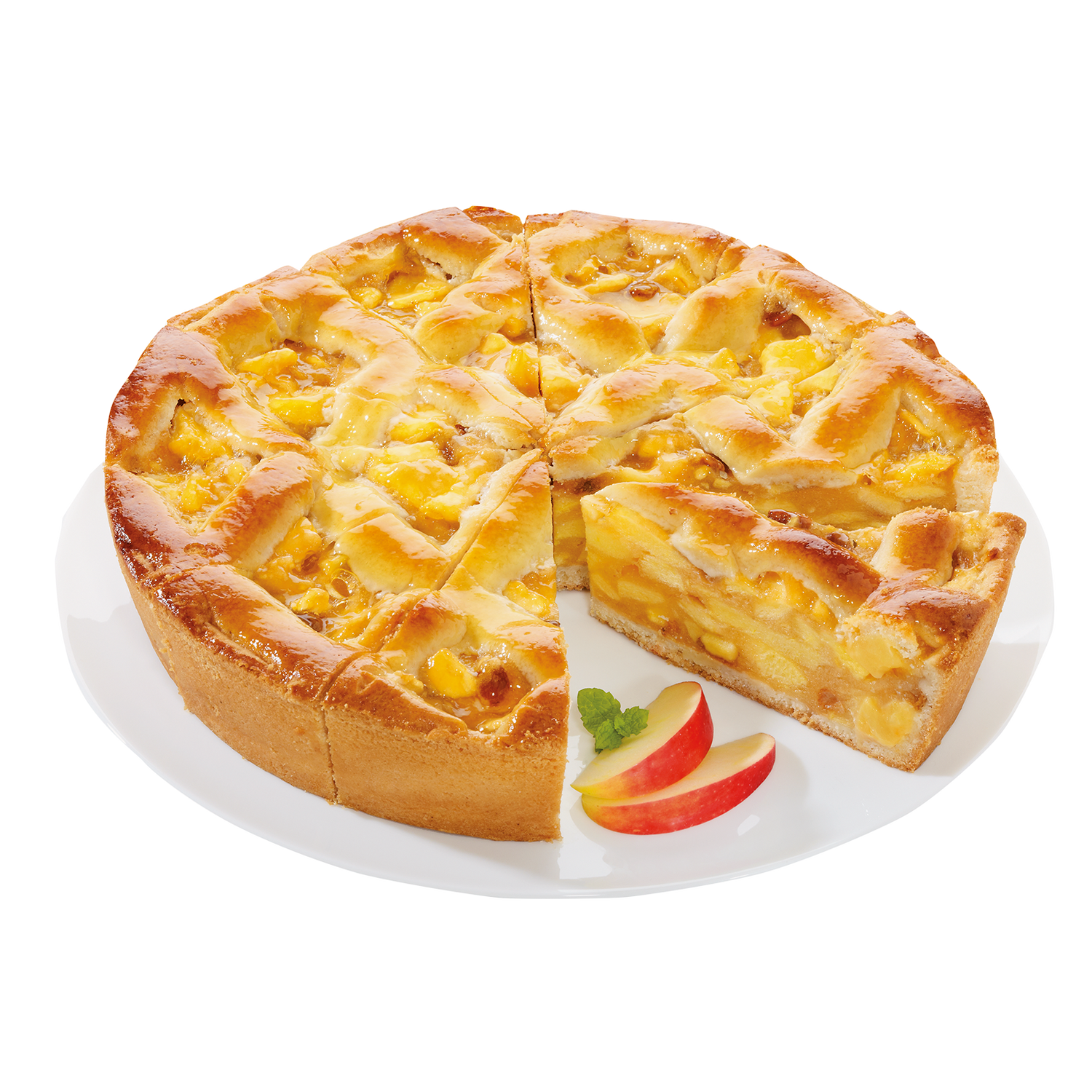 | Verkehrsbezeichnung: | Mürbeteigkuchen mit Apfel-Füllung (69%) und Mürbeteig-Gitter, mit Tortenguss abgeglänzt, tiefgefroren, vorgeschnitten in 12 Portionen. |