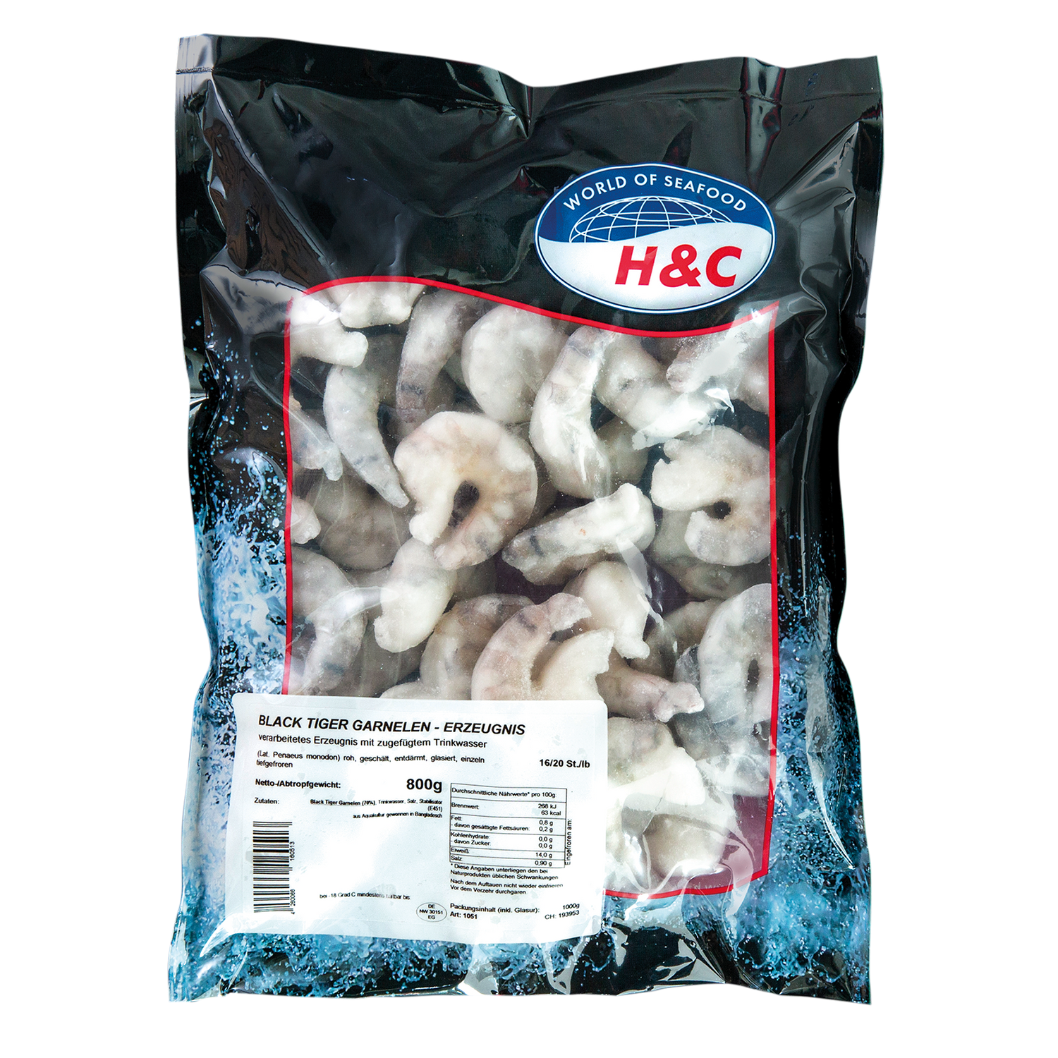 | Verkehrsbezeichnung: | Black Tiger Garnelen, verarbeitetes Erzeugnis, mit zugesetztem Trinkwasser, tiefgefroren |