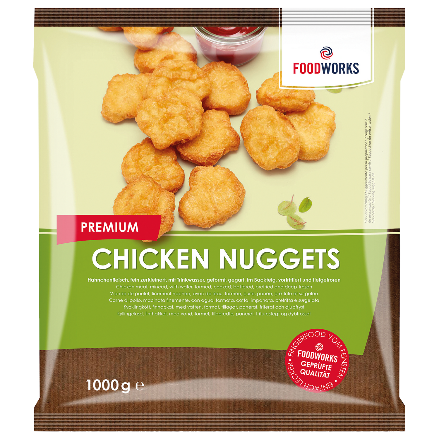 Chicken Nuggets Premium TK 1kg(ca 22g) Foodworks - Karton à 12 BT ist auf Lager und wird versandt, sobald es wieder verfügbar ist