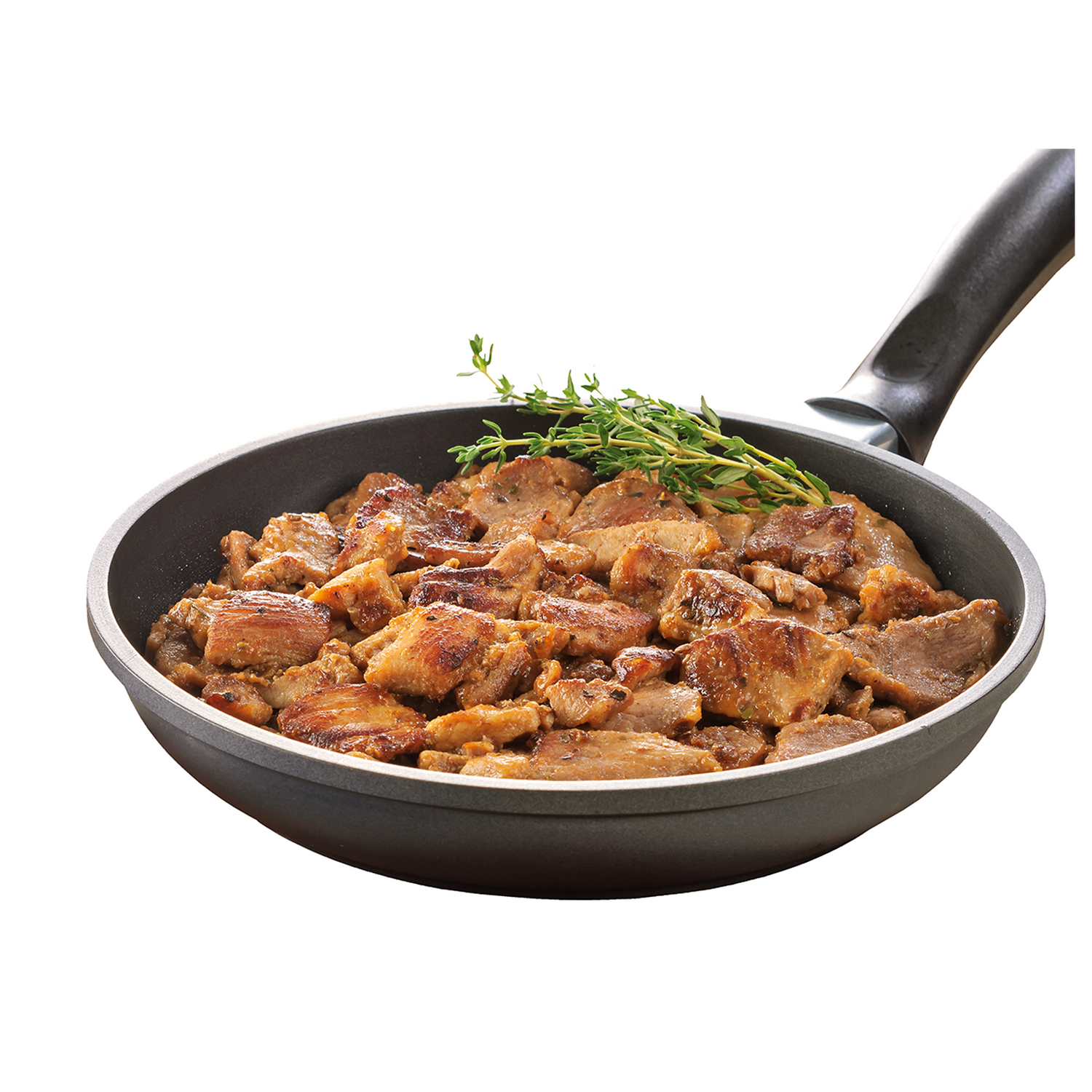 | Zubereitungshinweis | ***Braten mit wenig Bratfett*** Pfanne: Das Produkt gefroren ohne weitere Fettzugabe bei starker Hitze braten ***Konvektionsgaren*** Konvekomat: Auf 160°C / 40% Feuchte vorheizen, 2,5 kg des gefrorenen Produktes auf ein 1/1 Edelstahl-GN-Blech aufschütten und ca. 14 Min. erhitzen. Das Produkt vor der Ausgabe durchmischen |
