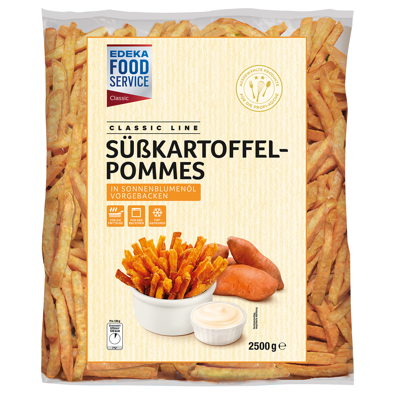 | Zubereitungshinweis | Fritteuse: Die Süßkartoffel-Pommes unaufgetaut in nicht zu großer Menge in eine Fritteuse mit 160-175°C heißen Fett geben und ca. 3-4 Minuten backen. Den Korbeinsatz herausnehmen und abtropfen lassen. Backofen (Umluft): Die Süßkartoffel-Pommes unaufgetaut auf einem Backblech verteilen und bei 180°C ca 22 Minuten bis zum gewünschten Bräunungsgrad backen. Backofen (Ober-/Unterhitze): Die Süßkartoffel-Pommes unaufgetaut auf einem Backblech verteilen und bei 200°C ca 22 Minuten bis zum gewünschten Bräunungsgrad backen. |