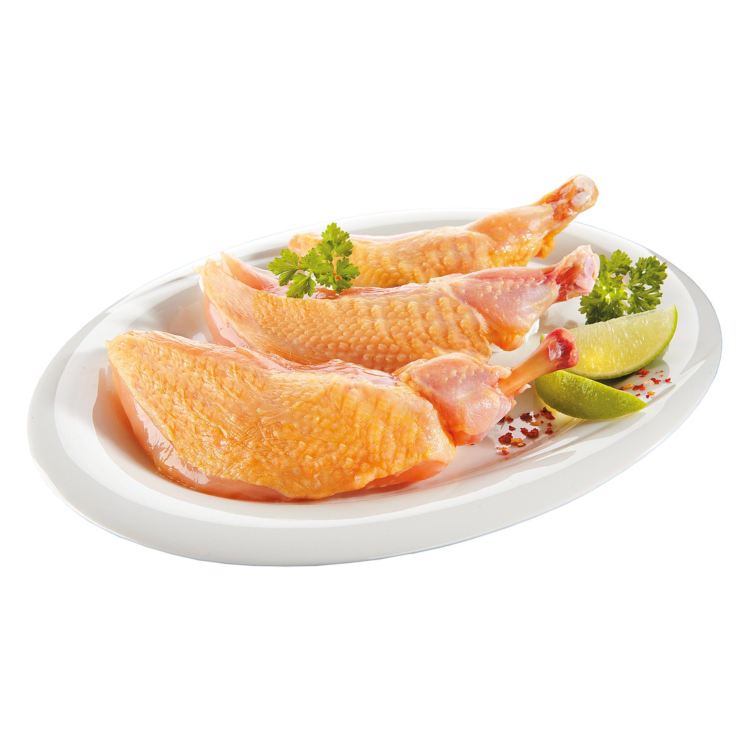Die zarte und geschmackvolle Brust des Perlhuhns mit dem kleinen Flügelknochen. Die Perlhuhnbrust kann mit Salz, Pfeffer und Kräutern angebraten oder gegrillt werden.
