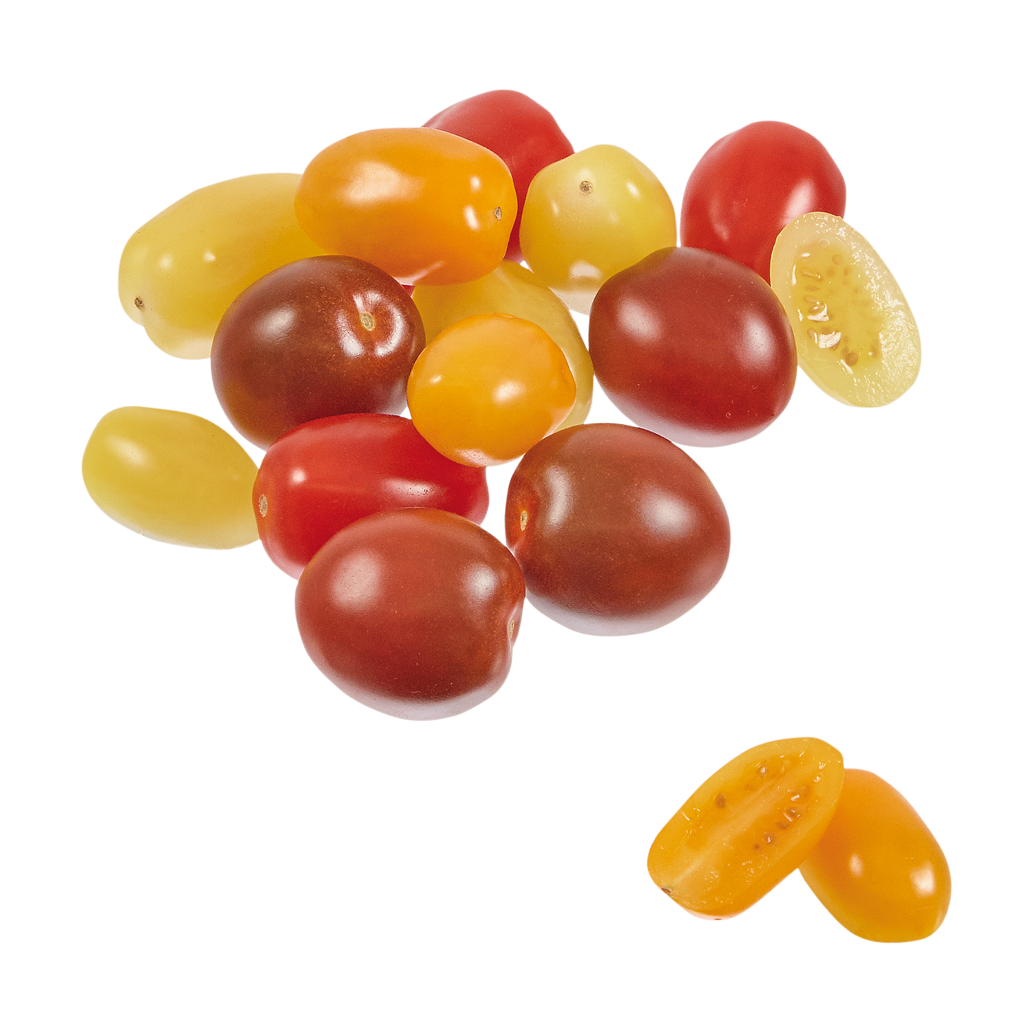 Kleine Roma-Cherry-Tomaten gemischt in den Farben rot und orange/gelb im PVC-Becher mit Deckel.
