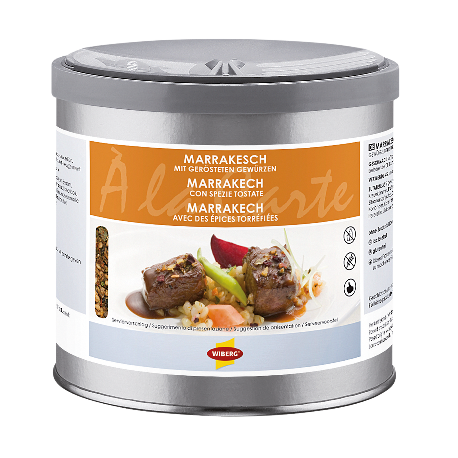 Die Marrakesch-Gewürzmischung ist im Geschmack kräftig nach gerösteten Gewürzen, belebende Chilli-Schärfe und frische Minznote.