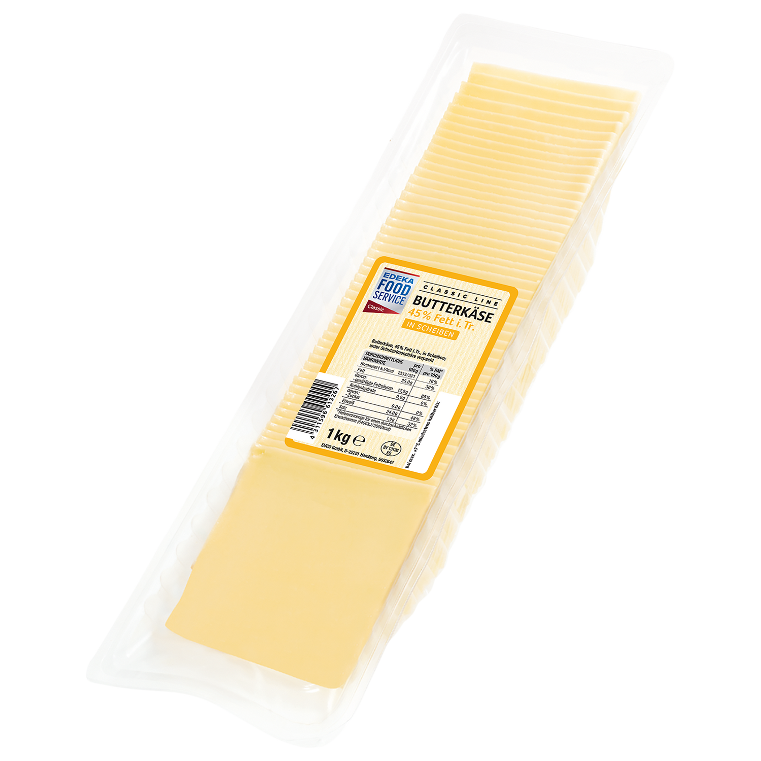 | Verkehrsbezeichnung: | Butterkäse, 45% Fett i.Tr., in Scheiben |