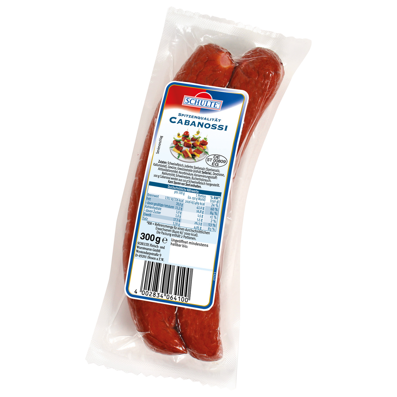 | Zutatenliste | Zutaten: Schweinefleisch, jodiertes Speisesalz (Speisesalz, Kaliumjodat), Gewürze, Gwürzextrakte (enthält SELLERIE), Dextrose, Antioxidationsmittel: Ascorbinsäure, Konservierungsstoff: Natriumnitrit, Schweinedarm, Buchenholzrauch. Kann Spuren von SENF enthalten. 100g Cabanossi werden aus 110g Schweinefleisch hergestellt. |