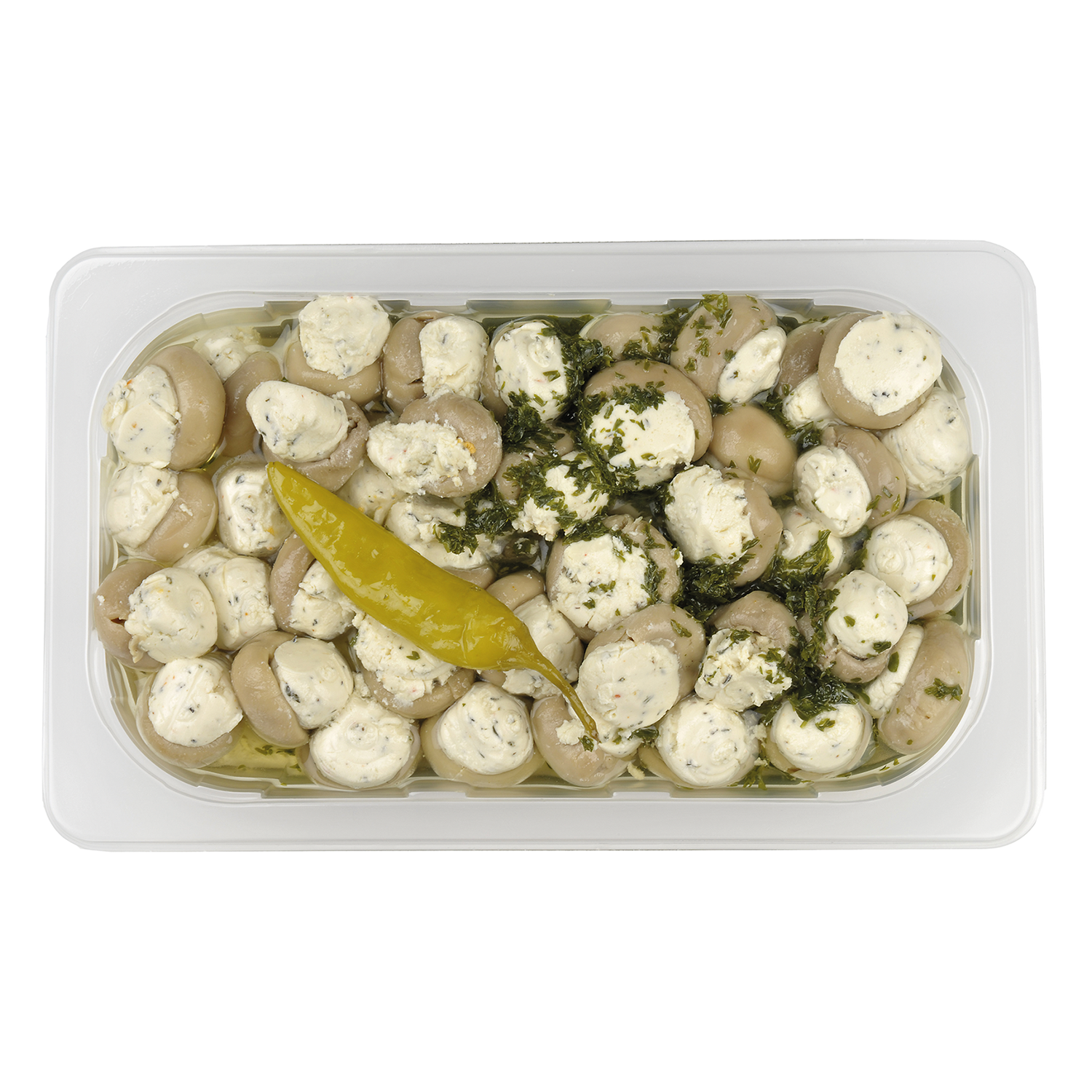 | Verkehrsbezeichnung: | Champignon-Köpfe gefüllt mit Frischkäsezubereitung, eingelegt in Rapsöl |