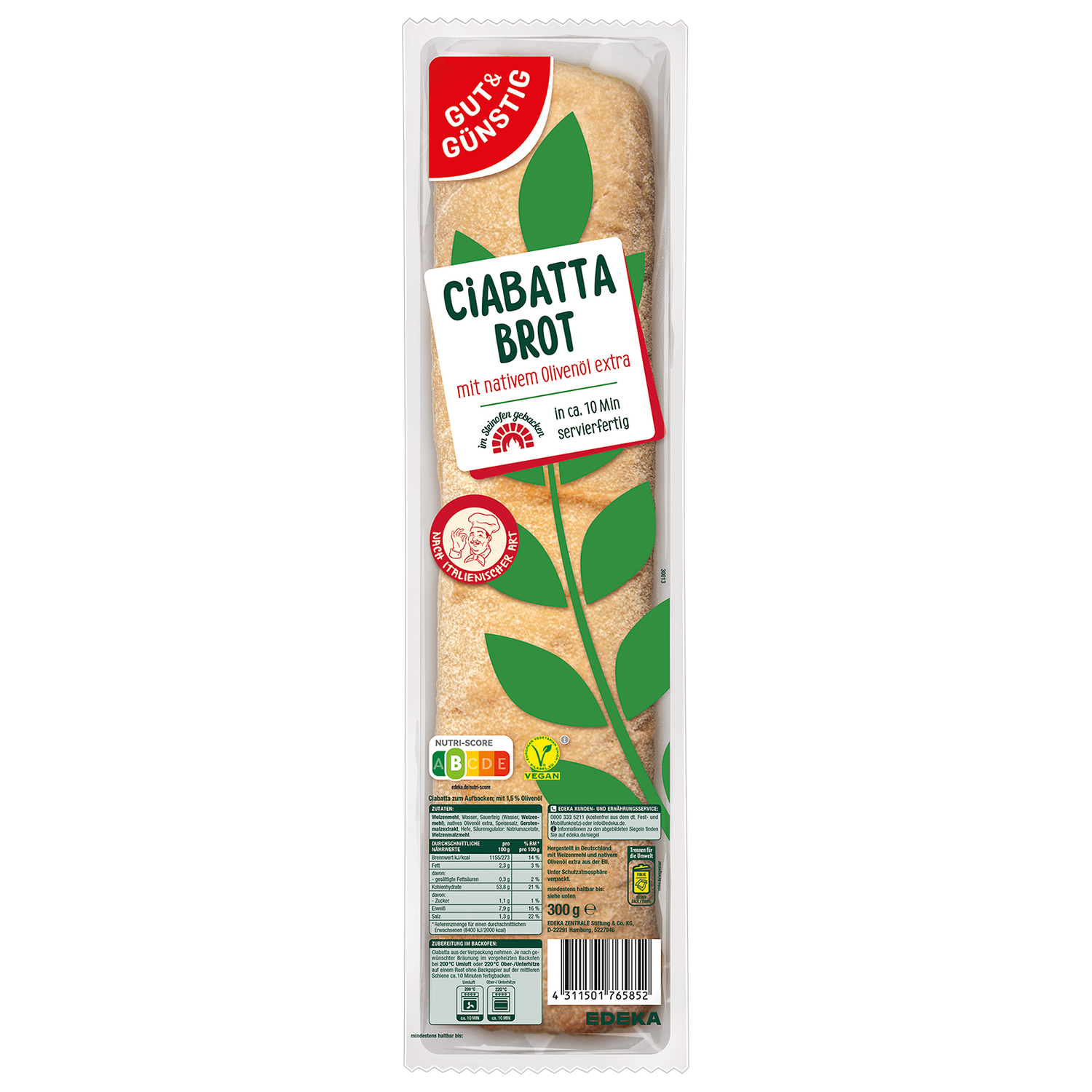 | Zubereitungshinweis | Backofen: Ciabatta aus der Verpackung nehmen. Je nach gewünschter Bräunung im vorgeheizten Backofen bei 200°C Umluft oder 220°C Ober-/Unterhitze auf einem Rost ohne Backpapier auf der mittleren Schiene ca. 10 Minuten fertigbacken. |
