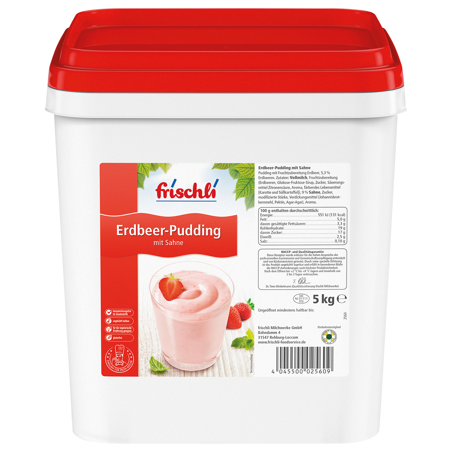 | Verkehrsbezeichnung: | Pudding mit Fruchtzubereitung Erdbeer, 5,3% Erdbeeren |