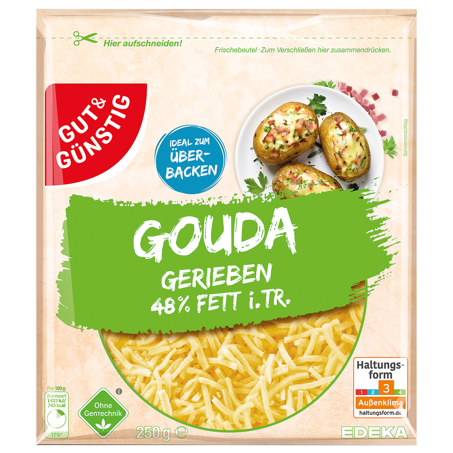 | Verkehrsbezeichnung: | Gouda gerieben, 48% Fett i. Tr. |