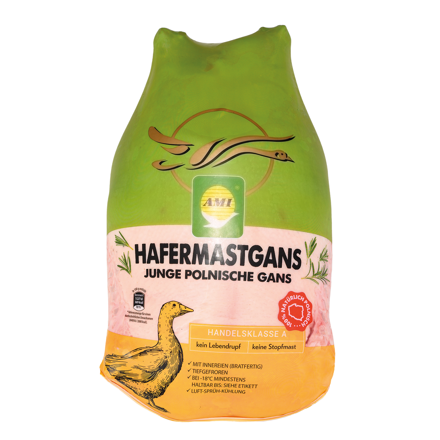 | Verkehrsbezeichnung: | Junge polnische Hafermastgans mit Innereien, HKL A, tiefgefroren |