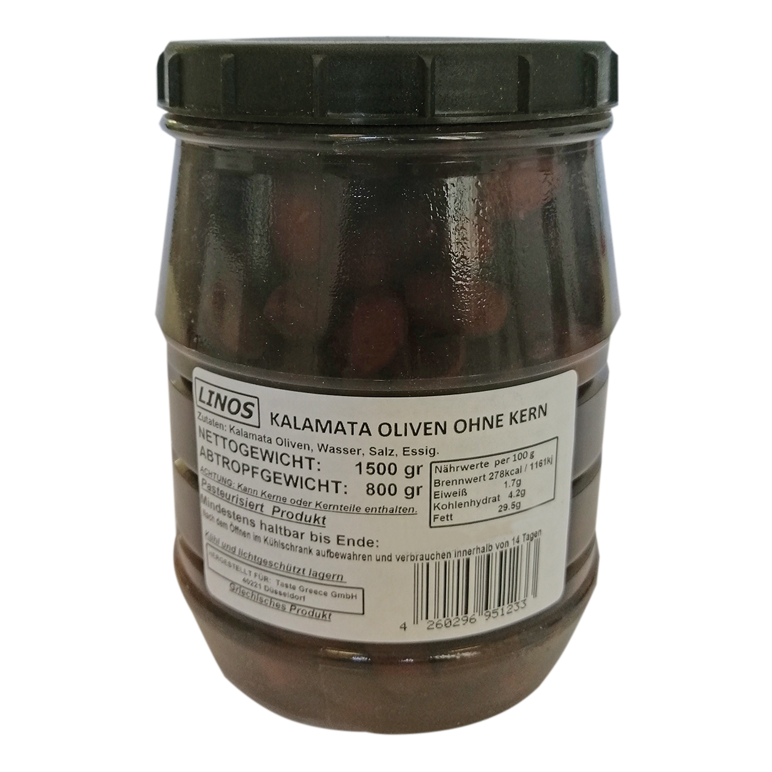 | Zutatenliste | Oliven, Wasser, paprika-Paste, Natriumalginat, Guarkernmehl, Calciumchlorid, Kaliumsorbat, |