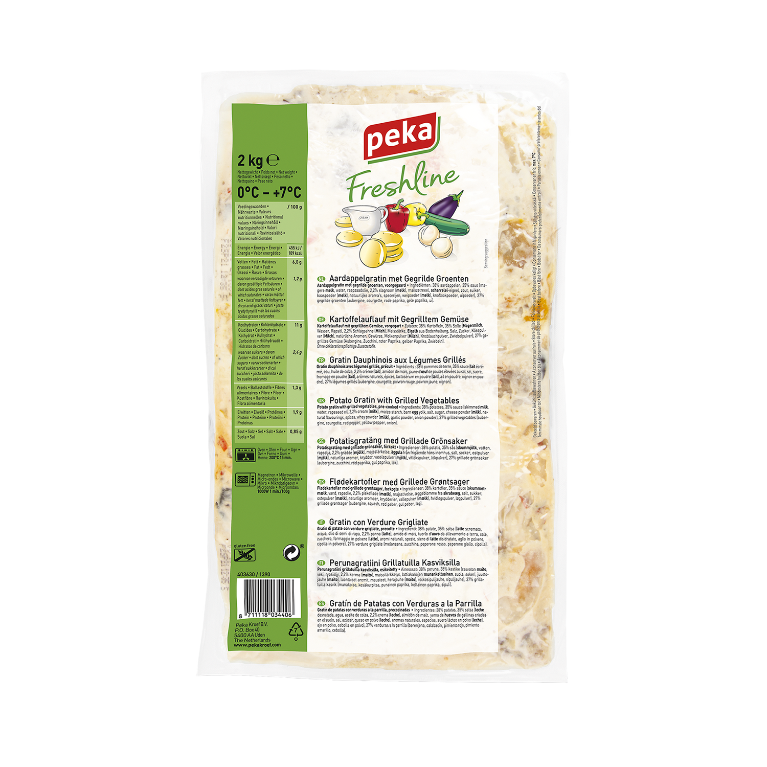 | Zutatenliste | 38% Kartoffeln, 35% Soße [MAGERMILCH, Wasser, Rapsöl, 2,2% Schlagsahne (MILCH), Maisstärke, EIGELB aus Bodenhaltung, Salz, Zucker, Käsepulver (MILCH), natürliche Aromen, Gewürze, Molkenpulver (MILCH), Knoblauchpulver, Zwiebelpulver], 27% gegrilltes Gemüse (Aubergine, Zucchini, roter Paprika, gelber Paprika, Zwiebeln). |
