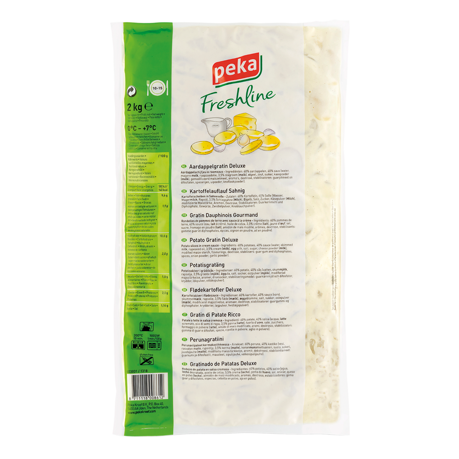 | Zutatenliste | 60% Kartoffeln, 40% Soße (Wasser, Magermilch, Räpsöl, 3,5% Schlagsahne (Milch), Eigelb, Salz, Zucker, Käsepulver (Milch), modifizierte Maisstärke, Aromen, Dextrose, Stabilisator: Guarkenmehl und Dinatriumdiphosphat, Gewürze, Zwiebelpulver, Knoblauchpulver). |