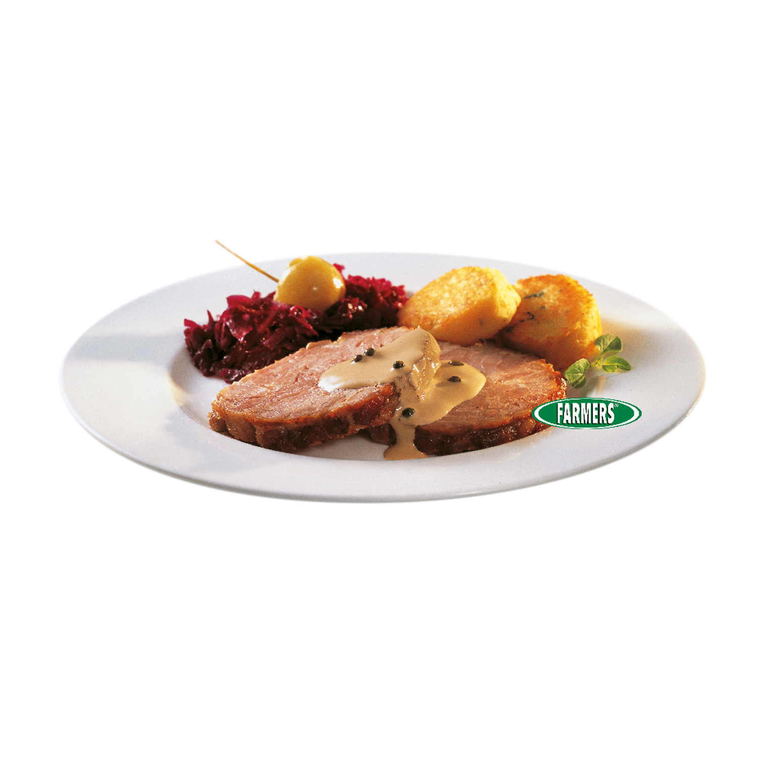 | Zubereitungshinweis | ***Backen*** Backofen: Gefroren, ohne Beutel auf dem Backblech bei 180 °C ca. 3 Stunden (G-Herd: Stufe 4) braten. Kerntemperatur soll 75 °C sein. Dann 10 min. ruhen lassen, bevor das Netz entfernt und aufgeschnitten wird. Im Heissluft-Backofen die Backzeit und Temperatur nach der Gebrauchsanweisung des Ofens richten. |