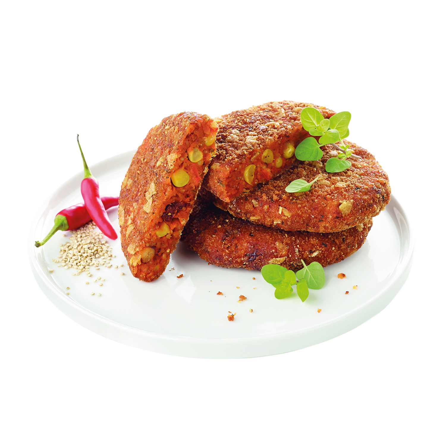 Vegetarischer Bratling. Burger mit Chili und Quinoa. Der Burger ist bereits vorfrittiert und kann somit schnell eingesetzt werden. Perfekt zu einem Apfel Curry Relish.